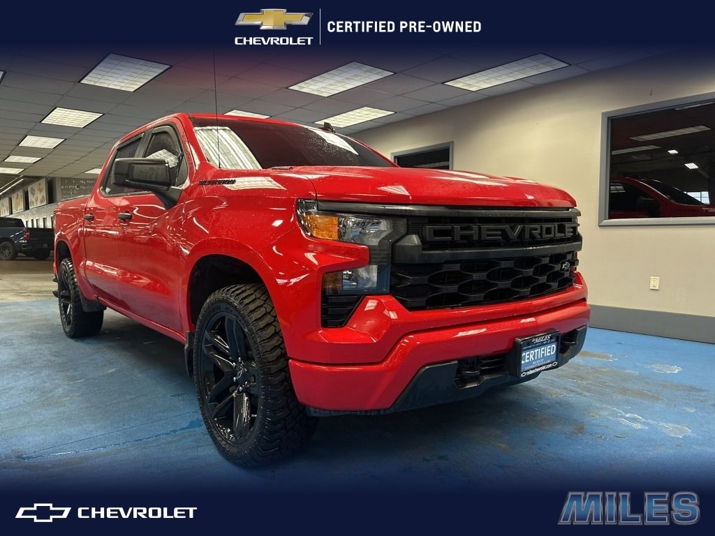 4G LTE WI-FI (R) Hot spot w/3GB/3 mo Data Trial, Alloy Wheels, Android Auto/Apple Carplay Navagation, Bluetooth phone, Rear vision camera, All Wheel Drive, Remote Start, Carfax 1 owner, Silverado 1500 Custom, 4D Crew Cab, 2.7L I4 Turbocharged DOHC 16V LEV3-SULEV30 310hp, 8-Speed Automatic, 4WD, Red Hot, Black Cloth, 10-Way Power Driver Seat w/Lumbar, 120-Volt Bed Mounted Power Outlet, 120-Volt Interior Power Outlet, 3.5 Monochromatic Display Driver Info Center, 4 Black Round Assist Steps (LPO), Black Chrome Exhaust Tip (LPO), Black Name Plates (LPO), Bluetooth® For Phone, Color-Keyed Carpeting Floor Covering, Custom Convenience Package, Custom Value Package, Dark Essentials Package (LPO), Deep-Tinted Glass, Dual Rear USB Ports (Charge Only), Electric Rear-Window Defogger, Electronic Cruise Control, EZ Lift Power Lock & Release Tailgate, Front Frame-Mounted Black Recovery Hooks, Front Rubberized Vinyl Floor Mats, HD Rear Vision Camera, High Capacity Suspension Package, Hitch Guidance, LED Cargo Area Lighting, Manual Tilt Wheel Steering Column, OnStar Services Capable, Power Front Windows w/Driver Express Up/Down, Power Front Windows w/Passenger Express Down, Power Rear Windows w/Express Down, Preferred Equipment Group 1CX, Rear 60/40 Folding Bench Seat (Folds Up), Rear Rubberized-Vinyl Floor Mats, Remote Keyless Entry, Remote Vehicle Starter System, SiriusXM Trial Subscription, Standard Tailgate, Teen Driver, Theft Deterrent System (Unauthorized Entry), Tire Pressure Monitoring System, Trailering Package, TurboMax Blackout Package, Wheels: 20 x 9 High Gloss Black Painted Alum, Wi-Fi Hot Spot Capable.Odometer is 3966 miles below market average!CARFAX One-Owner. Clean CARFAX.Certified. Chevrolet Certified Pre-Owned Details:* Powertrain Limited Warranty: 72 Month/100,000 Mile (whichever comes first) from original in-service date* Transferable Warranty* 24 months/24,000 miles (whichever comes first) Certified Pre-Owned Scheduled Maintenance Plan and 3 days/150 miles (whichever comes first) Vehicle Exchange Program. SiriusXM 3-month trial subscription.* Vehicle History* Limited Warranty: 12 Month/12,000 Mile (whichever comes first) from certified purchase date* 172 Point Inspection* Warranty Deductible: $0* Roadside AssistanceRed Hot 2025 Chevrolet Silverado 1500 Custom 2.7L I4 Turbocharged DOHC 16V LEV3-SULEV30 310hp 8-Speed Automatic 4WDMiles Chevrolet proudly serving the following communities Decatur, Springfield, Forsyth, Champaign, Bloomington, Lincoln, Taylorville, Pana, Shelbyville, Sullivan, Maroa, Warrensburg, Macon, Moweaqua, and Mt. Zion.
